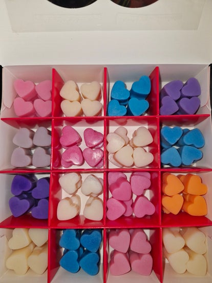 Boîte contenant 128 fondants parfumé de différentes odeurs 8 fondants par case : Linge frais, fleur de coton, gateau vanille, viollette de parme, tubéreuse prestigieuse , barbe à papa, pina colada, alien, douceurs des iles , poudre de bebe , rose d'amour, fruits rouges, monoï vanillé, musty, monoï rosé, la vie est belle .
